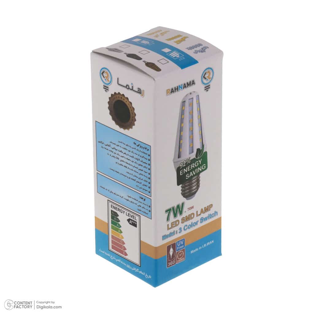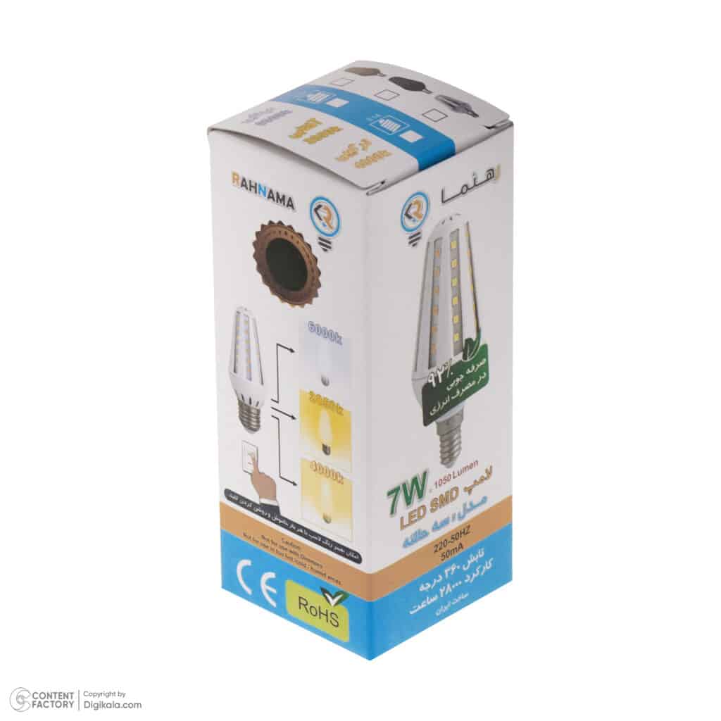 لامپ سه حالته لوستری پرنور 7 وات رهنما مدل شمعی پایه E14 نوعی از لامپ است که با هر بار خاموش روشن کردن کلید تغییر رنگ می دهد. به این معنی که شما می توانید صبح هنگام از نور مهتابی و ظهر هنگام از نور ترکیبی و شب هنگام از نور آفتابی تنها با یکبار خاموش روشن کردن کلید بهره ببرید . البته استفاده از رنگ ها در اوقات شبانه روز کاملا سلیقه ای بوده و به صورت خودکار عوض نمی شود. عمده مصرف این نوع لامپ در لوستر می باشد و میتواند در تالارها، استدیو فیلمبرداری ، منازل ، کتابخانه ها، و مساجد استفاده شود. توجه داشته باشید که این لامپ نسبت به وات مصرفی آن بسیار پر نور است و اغلب در اماکنی با ارتفاع سقف بالا نصب می شود و نصب آن در اماکن کوچک و خانگی رایج نیست. بهترین لامپ مشابه برای مصرف خانگی مدل ZB32 است که لینک آن در پایین صفحه گذاشته شده است.